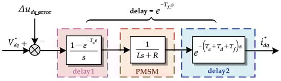 Considering the influence of the inverter’s nonlinear error voltage, Δudq_error is treated as a disturbance at the voltage command input. The detailed block diagram of the delay part in the current loop is shown in Figure 10. Figure 11 presents the block diagram used for delay time constant identification and parameter correction.