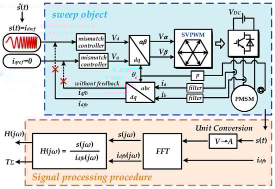 Given the critical role of PMSM resistance–inductance parameters and current loop delay modeling in controller tuning, this paper proposes a parameter calibration method based on open-loop frequency sweeping. Initially, the motor’s preliminary resistance and inductance parameters are identified by injecting proposed pulse–sine voltage signal under open-loop conditions. The identified inverse motor model is then used as a gain function for the open-loop frequency sweep. This sweeping process is performed in the rotating (d-q) reference frame. By analyzing the frequency response of the controlled plant obtained from experimental measurements, the degree of mismatch in the initially identified motor parameters can be directly assessed, enabling more accurate calibration.
