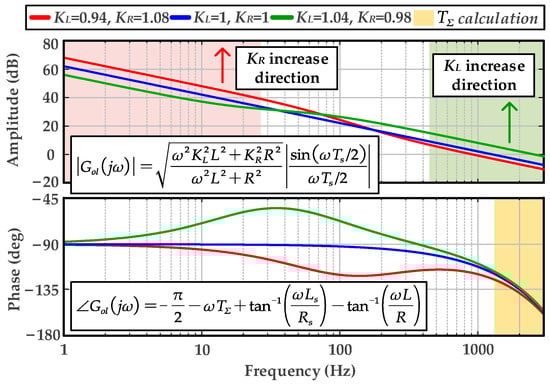 Frequency characteristics of open-loop curve under different RL mismatch. The red and green shades represent the primary influence ranges of KR and KL on the curve, respectively.
