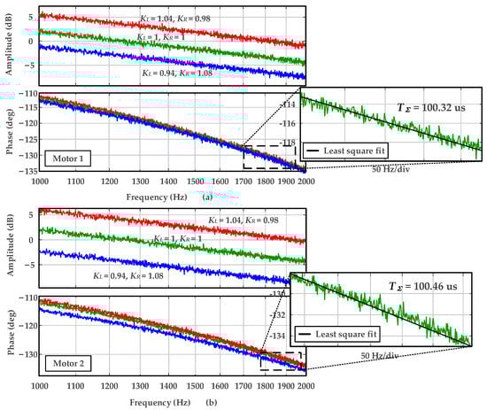Figure 13a,b show the identified delay time constant TΣ using Motor 1 and Motor 2 as the plant under three different RL mismatch conditions. It is obvious that, despite differences in magnitude, the phase–frequency curves exhibit nearly identical slopes. The identified delay time constant TΣ in Figure 13a,b are 100.32 μs and 100.46 μs, respectively. The experimental results align well with the theoretical values, indicating that the proposed delay time constant identification strategy is not affected by parameter mismatch.