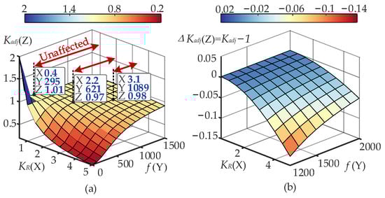 Figure 14 illustrates the impact of KR on parameter adjustment across different frequency ranges. In Figure 14a, as the frequency (Y-axis) increases, the influence of KR gradually diminishes, resulting in flatter curves. When the frequency decreases, Kadj decreases with increasing KR. Therefore, the parameter adjustment process in this paper is carried out within the 1–500 Hz frequency range.