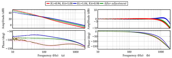 The hardware and software experimental platforms used in this section are the same as those described above. This section presents experiments based on Motor 1, where the inductance and resistance identified in Section 2 serve as the parameters to be adjusted: (1) KL = 0.94, KR = 1.08; (2) KL = 1.04, KR = 0.98. The normalized gain γ is set to the default value of 0.5. The frequency characteristics of the open- and closed-loop systems, before and after adjustment, are obtained through sweep and filtering (the raw data collected are smoothed by the Hample filter, Savitzky–Golay filter, and Gaussian filter [35]), as illustrated in Figure 15.