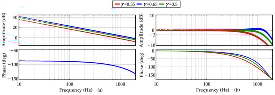 Based on the adjusted system shown in Figure 17, fine-tuning of bandwidth and dynamic performance can be achieved by modifying the normalized gain γ. Three comparison groups are defined as follows: (1) γ = 0.35; (2) γ = 0.5; (3) γ = 0.65. The open- and closed-loop Bode plots of the current loop under the three conditions are shown in Figure 17.