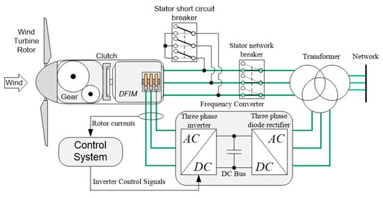 A wind turbine drives the shaft of a doubly fed induction machine through a coupling and step-up gearbox in a wind power system that operates under normal conditions (Figure 1). The stator of the DFIM is connected to a three-phase transformer via a “Stator Network Breaker” contactor, which provides galvanic isolation and aligns the generated voltage with the grid voltage. To excite the DFIM, a voltage and frequency converter is connected to the rotor circuit, powered through a separate transformer winding from the mains voltage. The inverter’s power section is conventional, comprising an input three-phase diode bridge, a capacitive low-pass filter, and a three-phase inverter. Feedback signals, including rotor currents and, if needed, information about the rotor’s speed and wind speed, are fed into the VFC control system.