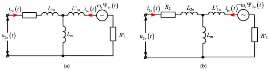 The system of differential Equation (10) corresponds to the equivalent circuits of the DFIM shown in Figure 3a,b in the stationary coordinate system u, v, which is rigidly connected to the rotor.