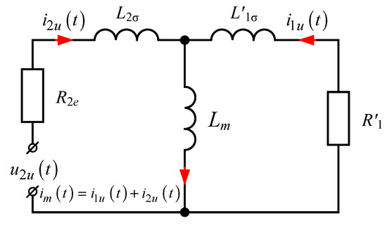 The T-shaped equivalent circuit of the DFIM with a stationary rotor and closed secondary windings, corresponding to the differential equations, is shown in Figure 4.