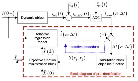 In theoretical scenarios, the initial current signal iinit(t) is directly observable; however, in real-world systems, this signal is mixed with measurement system noise ξ1(t). This noise ξ1(t) includes interference resulting from measurement channel inefficiencies and sensor regulation imperfections, such as insensitivity, saturation, and hysteresis. When the signal passes through an analog-to-digital converter, two transformations occur: temporal sampling with period Δt; and level quantization, introducing additive quantization noise ξ2(t), which hinges on the ADC’s resolution. For later computations, it is assumed that total noise ξ(t) = ξ1(t) + ξ2(t) is analogized to Gaussian-distributed white noise. The measured signal from the system’s output, the dynamic object’s current iout.ADC(n·Δt) (where n indicates the nth sampling step from the outset of identification), is obtained using a microcontroller. From this signal iout.ADC(n·Δt), we extract the steady-state current value i(0+) captured during the initial identification phase, as well as the free current component imeas(n·Δt). Note that n also denotes the instants beyond which the current decay monitoring begins. The microcontroller performs an iterative procedure to estimate the parameters of the adaptive dynamic object model. This approach calculates a target function based on the difference between the measured current value imeas(n Δt) and the response of the adaptive regression model to estimate the necessary parameters of the adaptive model (). An iterative calculation within the target function’s minimization block refines the parameter estimates are refined until the predefined minimum of the target function is achieved, denoted by the index k of the iterative identification process. Initial approximations for the estimates are established before computations begin. The iterative process concludes once the specified condition for the target function’s minimum is fulfilled or if the maximum iteration count is surpassed, at which point the final evaluations are provided. Notably, the accuracy of the resulting estimates correlates with the quantization error of the ADC used in the measurement system.