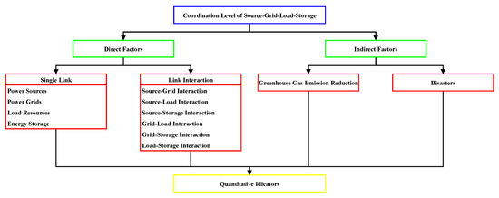With the increase in the rate of renewable energy penetration, the energy supply is becoming more diversified [25,26]. Zhan et al. [25] proposed a strategy that aggregated multiple distributed resources, such as distributed photovoltaics, energy storage, and controllable load, emphasizing the coordination and optimization between distributed resources. Li et al. [26] established a new day-ahead optimal dispatching model for a power system with a high proportion of photovoltaic energy sources Firstly, the consumption of the renewable energy is promoted by the development of the energy-storage technology. Secondly, in the demand-response strategy, the user is willing to actively adjust the load based on the power output. Therefore, as the structure of the power system becomes more complex, the coordination level of the power system is significantly affected by a series of uncertain risk factors, including direct factors and indirect factors. The direct factors are divided into single-link and link-interaction factors, where single-link factors include power sources, power grids, load resources and energy storage, link interaction includes source-grid interaction, source-load interaction, source-storage interaction, grid-load interaction, grid-storage interaction, and load-storage interaction. The indirect factors are divided into greenhouse gas emission-reduction benefits and disasters. The power sources are responsible for generating electricity, which is transported to the power grids. To keep the balance between power sources and power grids, the amount of electricity generated by power sources should be equal to the amount of electricity absorbed by power grids. However, different types of power sources are used to generate electricity, including traditional thermal-power plants, water-power plants, and renewable wind or solar power plants. The fluctuation of renewable wind and solar power plants is strong and is affected by environment factors. The balance between power sources and power grids affects the coordination level. Meanwhile, the load resources are not constant, but vary significantly with time. To improve the economy and stability of the power system, achieving balance between power grids and load resources is important. If power generation exceeds load demand, wind and solar energy may be wasted, negatively affecting economic efficiency. Conversely, if load demand exceeds power generation, system stability decreases, impairing the power system’s level of coordination.