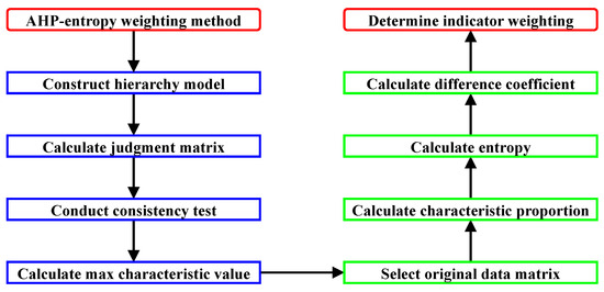 However, the indicator weighting determined by AHP is significantly influenced by the evaluator’s understanding of the evaluation problem, making it a subjective method. To overcome the subjectivity in the indicator weighting of AHP, the entropy weighting method is adopted, as it is more objective. To combine the advantages of AHP and the entropy weighting method, the AHP-entropy weighting method is adopted to determine the indicator weighting to be used in comprehensive coordination-level evaluation. Figure 2 shows the flowchart of the AHP-entropy weighting method. Firstly, construct the hierarchy model of the evaluation object, including the target layer, principle layer, and indicator layer. Secondly, calculate the judgment matrix, where every two indicators are compared. If the importance of the indicator i is equal to that of the indicator j, the value of the judgment matrix ; if the indicator i is slightly more important than the indicator j, the value of the judgment matrix ; if the indicator i is clearly important compared to the indicator j, the value of the judgment matrix ; if the indicator i is very important compared to the indicator j, the value of the judgment matrix ; if the indicator i is extremely important compared to the indicator j, the value of the judgment matrix . We should point out that the value of the indicator j relative to that of the indicator i is the reciprocal of the value of the indicator i to the indicator j. These are defined as follows: . Thirdly, conduct the consistency test, which is defined as follows: