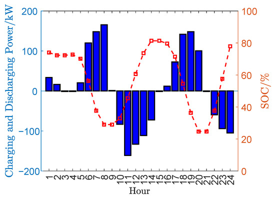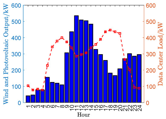 Figure 3 shows wind and photovoltaic output and data-center load on a typical day in Xining City, Qinghai Province. The randomness of wind and photovoltaic output and the fluctuation in the data-center load require balancing; therefore, the fast charging and discharging capabilities of energy-storage devices are useful. As shown in Figure 4, energy-storage devices discharge to compensate for insufficient wind and photovoltaic output during peak load periods; energy-storage devices charge to reduce the amount of abandoned wind and photovoltaic output during low-load periods; where charging power is negative, discharging power is positive.