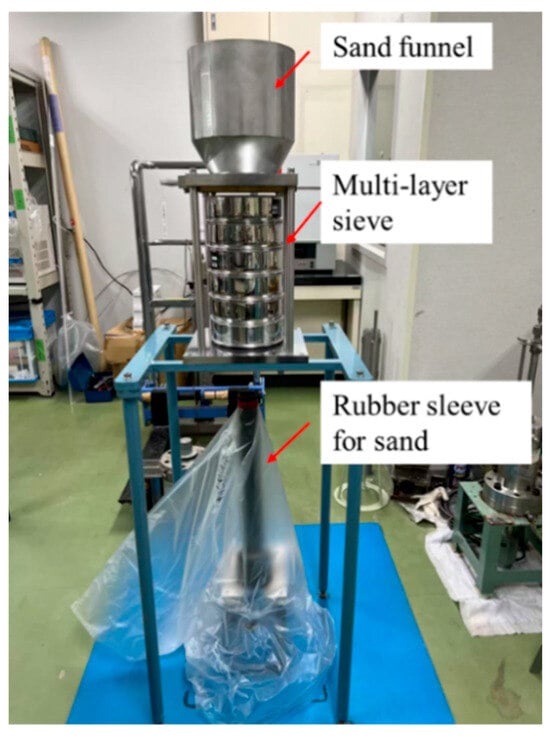 To minimize the impact of heterogeneity in natural formations on internal flow behavior, uniform-grained Tohoku silica sand No. 8 (average particle diameter: ~0.12 mm) was selected as the experimental sand specimen. This sand meets the Japanese Industrial Standards (JIS), and its particle size is comparable to that of typical reservoir sands. Previous studies have used Tohoku silica sand No. 8 to simulate the fine sand characteristics of MH reservoirs [17], indicating that it can effectively represent actual reservoir conditions. The cores were prepared using the Multiple Sieving Pluviation (MSP) method (as shown in Figure 1) to ensure uniform sand deposition and a controllable relative density. Dry sand was first poured into a funnel equipped with multiple sieves, which regulated the falling speed and flow rate of the sand particles to achieve uniform deposition while minimizing segregation and agglomeration. The sand particles were allowed to fall freely from a fixed height and were uniformly deposited into the rubber sleeve below, forming the sand-packed core used in subsequent experiments.