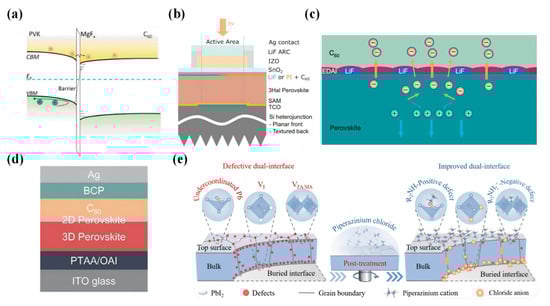 (a) A Energy lever diagram of the perovskite/C60 interface with MgFx passivation [43]. (b) Sketch of the perovskite silicon tandem device stack with LiF or PI [49]. (c) Schematic of the perovskite/electron transport layer (ETL) interface structure with LiF/EDAI bilayer passivation [56]. (d) The schematic diagram of the single-junction PSCs [57]. (e) Schematic illustration demonstrating the spatial distribution of piperazinium cation and chloride anion after PCl post-treatment [62].