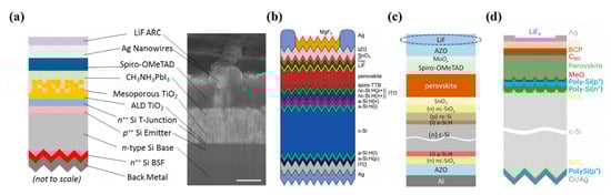 BSF. The conventional BSF solar cell configuration comprises a characteristic n+pp+ architecture featuring a screen-printed silver front grid contact, a hydrogenated silicon nitride anti-reflective coating, a phosphorus-doped n+ front emitter, a p-type silicon substrate, and a full-area screen-printed aluminum rear contact (Figure 6a). BSF solar cells have sustained industrial dominance in silicon photovoltaics for multiple decades, attributed to their structural simplicity, exceptional operational stability, continuous advancements in PCE, and streamlined manufacturing protocols. The inaugural demonstration of PSTSCs employing Al-BSF bottom cells was documented by Mailoa et al. [13], achieving a preliminary efficiency of 13.7%. Contemporary research indicates that all reported BSF-based PSTSCs exhibit constrained efficiencies below 23.5% [33,84,85], primarily limited by substantial carrier recombination losses at the rear contact interface.