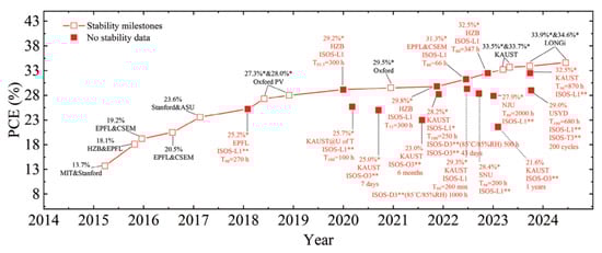 While 2T PSTSCs have achieved certified PCEs exceeding 34%, stability issues in PSTSCs remain a fundamental challenge. A timeline of perovskite/silicon tandem cell stability over the last decade is shown in Figure 7. Current stability assessments primarily follow International Summit on Organic Photovoltaic Stability (ISOS) guidelines, as conventional International Electrotechnical Commission (IEC) standards fail to adequately address halide perovskite-specific ion migration mechanisms. A certified 25.9%-efficient single-junction device maintains 94.8% initial PCE after 10,488 h dark storage (25 ± 2 °C, N2 environment) but conversely exhibits 10% power output degradation within 100 h of continuous illumination (AM 1.5G, 1 sun, 25 ± 2 °C, N2 environment) [38].