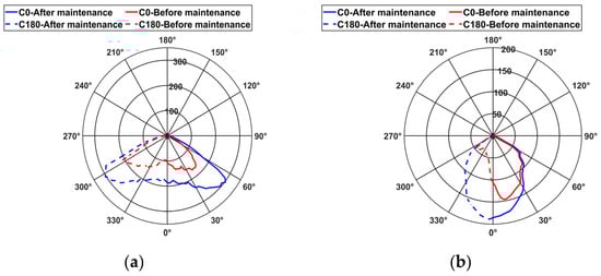 Comparison of the luminous intensity distribution of the tested luminaire before (“Before maintenance”) and after maintenance (“After maintenance”). (a) comparison of planes C0–C180, (b) comparison of planes C90–C270.