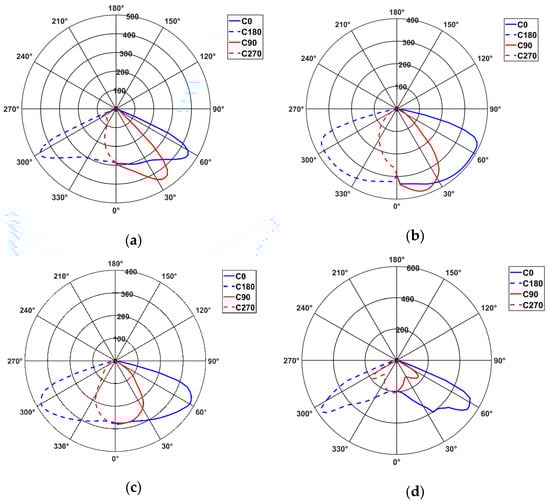 The luminous intensity distribution of the LED luminaires (a) LUM1, (b) LUM2, (c) LUM3, and (d) LUM4.