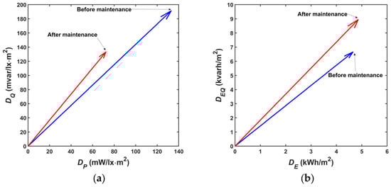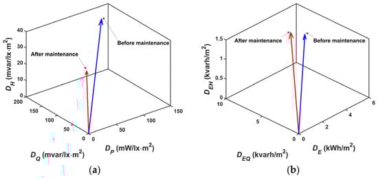 Vectors (a) DT and (b) DTE for the “After maintenance” and “Before maintenance” luminaire in their component 2D.