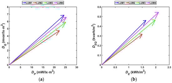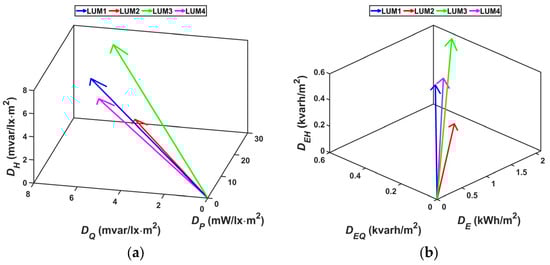 Comparison of vectors (a) DT for LED luminaires and (b) DTE for LED luminaires.