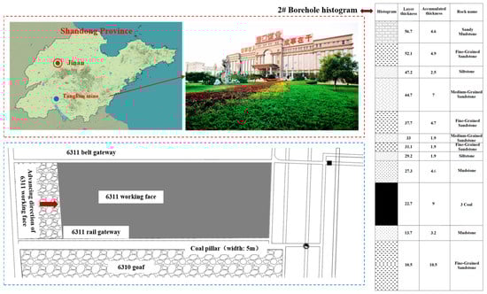 The 6311 working face of Tangkou Coal Mine is situated on the south side of the return airway in the sixth mining area, with an average depth of approximately 920 m. The 6311 working face extracts the No. 3 coal seam, where the dip angle of the coal (rock) seam ranges from 0~5° (with an average of 3°) and the dip direction is 30~330°. The coal seam thickness varies from 7.5~10.0 m, with an average thickness of about 9.3 m. The layout and comprehensive borehole histogram of the 6311 working face are presented in Figure 1.