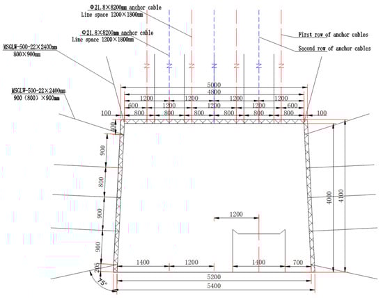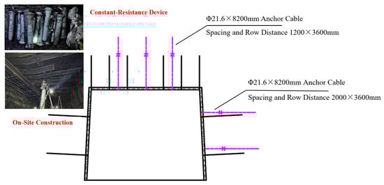 The on-site constant-resistance energy-absorbing anchor cable support scheme for the test section roadway is as follows: high-strength constant-resistance energy-absorbing anchor cables of Φ21.6 × 8200 mm are used for the roadway roof, with a spacing and row distance of 1200 × 3600 mm. For the solid coal rib side, two anchor cables are arranged per cross-section, with a spacing of 3600 mm, located in the same cross-section as the roof anchor cables. The upper and lower anchor cables are 1000 mm from the roof and floor, respectively, arranged perpendicular to the roadway rib, and the designed pre-tightening force of the anchor cables is 175 kN, consistent with the original on-site support. Figure 24 shows the on-site support layout of the roadway.