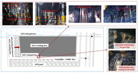 Before mining operations in the 6311 working face were initiated, the surrounding rock mass of the goaf-side roadway was impacted by tunneling activities, leading to the development of initial fractures in the coal and rock masses surrounding the roadway. Particularly in the weaker parts of the sidewalls, the coal mass exhibits flake spalling, gradually forming a loose and fragmented state with local collapses. At this stage, the fracture process is incomplete, allowing for temporary stability. After the completion of initial support measures, the surrounding rock of the roadway maintained overall stability for a certain period. However, as time progresses, stress redistribution leads to gradual damage to the surrounding rock: the upper loose rock mass fractures due to insufficient load-bearing capacity, and as the bulking volumes of the coal and rock masses increase, the metal mesh used in the initial support is bulged or even torn by the deformed coal mass, forming an obvious pocket-like structure. Under the influence of deep high ground stress, the coal mass in the middle of the roadway sidewall experiences shear failure, causing the entire sidewall to bulge outward in a noticeable arc. This kind of deformation not only impacts the safety of roadway passage but also endangers the overall stability of the surrounding rock during the service period of working face mining. Thus, it is essential to conduct in-depth research on the failure mechanism and support scheme optimization of goaf-side roadways. The deformation and failure of the goaf-side roadway in the 6311 working face are illustrated in Figure 3.