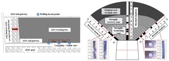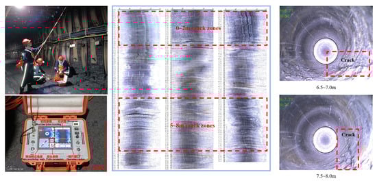 The borehole locations are arranged in front of the working face, with three typical cross-sections selected. The distance between each cross-section is approximately 100 m, depending on the specific conditions. The on-site borehole drilling depth is 8~12 m for the roof and 5~8 m for the sidewalls. The roof boreholes are drilled perpendicular to the roof or at a 45° angle, while the sidewall boreholes are horizontal or set at a 5° downward angle. Figure 4 shows the layout of the roadway borehole peeping scheme and the roof borehole peeping conditions.