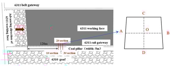Layout diagram of surrounding rock stress-monitoring sections in rail gateway of 6311 working face.