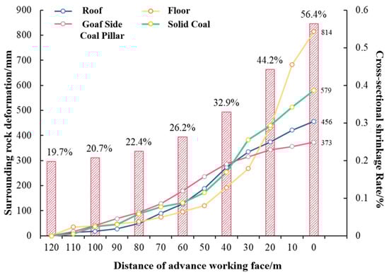 Data collation reveals the surrounding rock deformation of the rail gateway in the 6311 working face. As indicated by the curves in Figure 7, the maximum deformation characteristics of each part of the roadway follow the order of floor > production sidewall > roof > goaf side. The final deformation amounts at the four points are 814 mm, 579 mm, 456 mm, and 373 mm, respectively. The convergence of the roof and floor exceeds that of the two sidewalls, with the cross-sectional shrinkage rate reaching 56.4%.
