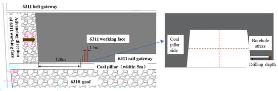 To analyze the stress variation process of the surrounding rock in the rail gateway of the 6311 working face, we arranged a 120 m monitoring section for stress data collection. Boreholes with different depths (3 m, 6 m, 9 m, 12 m, and 15 m) were drilled in the solid coal sidewall, with a spacing of 1.5 m between adjacent boreholes. Each borehole was located 1.5 m above the roadway floor, and the layout is shown in Figure 9.