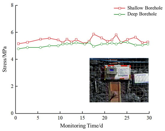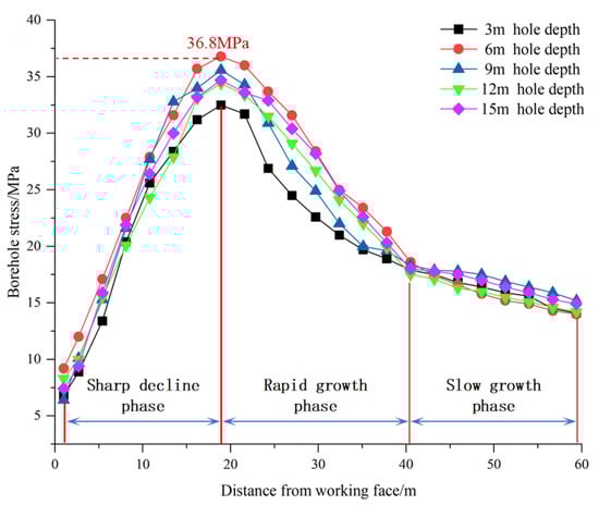By organizing the data, the stress-monitoring curves of the surrounding rock in the rail gateway can be obtained (Figure 10). According to the data variation trend, the stress variation process of the monitoring section can be roughly divided into three stages: the slow growth stage (40~60 m), the rapid growth stage (20~40 m), and the sharp decline stage (0~20 m). The maximum stress of 36.8 MPa occurs within the 6 m borehole position.