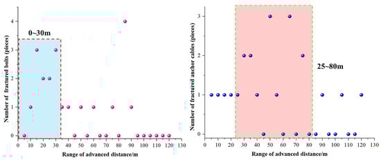 - Bolt/cable fractures are concentrated in specific areas: most bolts fracture within 30 m ahead of the working face, while anchor cables are mainly fractured in the range of 25–80 m ahead, with fracture positions primarily at the upper shoulder corners of the two sidewalls. This indicates that the original support has insufficient deformation resistance in high-stress disturbance zones and cannot adapt to the demand of intense roadway deformation.