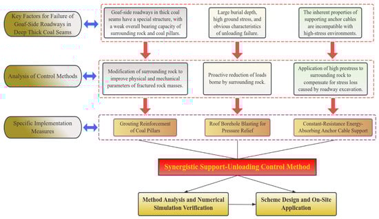 Targeting the complex stress environment faced by goaf-side roadways in deep thick coal seams and the key factors affecting their deformation and failure, a synergistic support–unloading control method more adaptable to the deep thick coal seam environment is proposed on this basis, with the technical road map shown in Figure 12.