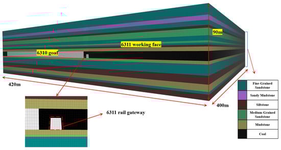 According to the actual engineering geological parameters, we built a numerical calculation model with FLAC3D finite difference software, as shown in Figure 13. The model has geometric dimensions of 420 m × 400 m × 90 m, and the roadway features a trapezoidal cross-section with a 4.8 m roof width, 5.2 m floor width, 4 m height, and 9.3 m thick coal seam. A 19.5 MPa uniform load is applied to the top to simulate the self-weight pressure of overlying strata, with corresponding pressure on the model’s side surfaces. Vertical displacement constraints are set at the model’s bottom, and horizontal displacement constraints are set on the left and right sides. The Mohr–Coulomb model is used for rock blocks in calculations, with the model discretized into eight-node hexahedral elements for structured meshing. Local mesh refinement was conducted for the roadway and working face mining areas to ensure calculation accuracy.