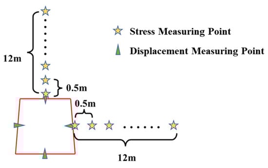 In this section, the roadway surrounding rock is taken as the research object, and the monitoring contents include the stress distribution and deformation magnitude around the roadway. A measuring line is arranged at the midline of the roadway roof and the solid coal rib, respectively, with measuring points placed on the measuring lines. The specific layout of the measuring points is shown in Figure 14.