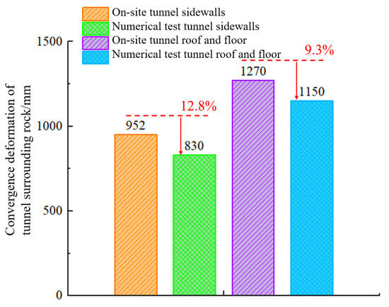 The test data were compared with the on-site-measured data, as shown in Figure 15. The difference rate of each value is within 13%, indicating that the model test is credible and consistent with the actual on-site conditions.