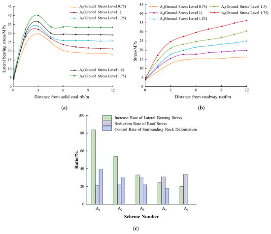 Schematic diagram of lateral bearing stress, roof stress, and index changes in roadways under different ground stress levels. (a) Variation diagram of roadway lateral bearing stress; (b) variation diagram of roadway roof stress; (c) schematic diagram of changes in evaluation indicators in different schemes.