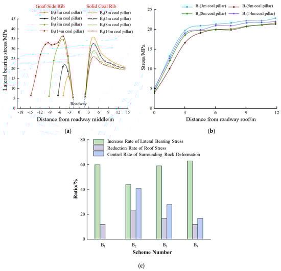 After completing the simulation of the scheme, the monitoring data were statistically analyzed to obtain the corresponding simulation results. The statistical data show the stress changes inside the solid coal rib in Figure 16a, the roof stress changes in Figure 16b, and the various evaluation indices of the roadway in Figure 16c.