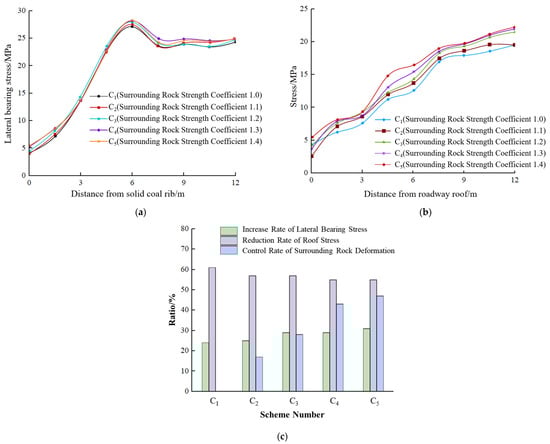 Similarly, the stress changes inside the coal pillar and solid coal are shown in Figure 17a, the roof stress changes in Figure 17b, and the various evaluation indices of the roadway in Figure 17c.