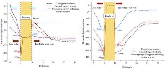 For vertical displacement, under the original support scheme, the maximum vertical displacement on the coal pillar side reaches 144 mm (a 12.2% reduction), while that on the solid coal side is 125 mm (a 14.4% reduction). In general, vertical displacement on the coal pillar side exceeds that on the solid coal side. Under the synergistic support condition, the maximum vertical displacement on the coal pillar side is 78 mm, and that on the solid coal side is 72 mm. The vertical displacement at all positions decreases significantly under synergistic support: compared with the original support scheme, the vertical displacement on the coal pillar side is reduced by approximately 45.8%, and that on the solid coal side by 42.4%. Similarly, the vertical displacement in the solid coal side stabilizes more rapidly.