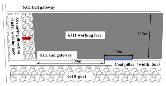 The on-site test section starts at 300 m ahead of the goaf-side roadway in the 6311 working face rail gateway, with a total length of 50 m. Within the test section, coal pillar grouting reinforcement, constant-resistance anchor cable support, and roof blasting borehole pressure relief are implemented on-site. A schematic diagram of the specific test section is shown in Figure 21.