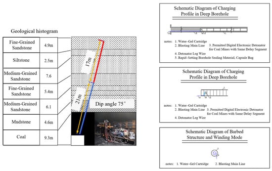 - Roof blasting borehole scheme: Specifically, in the rail gateway of the 6311 working face, deep-hole pre-splitting blasting measures were carried out along the dip direction of the working face. The borehole length is 38 m, the borehole angle is 75°, the borehole spacing is 15 m, the borehole diameter is 75 mm, and the distance from the borehole opening to the production side is 1 m.
