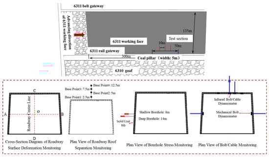 To monitor the changes in the surrounding rock of the 6311 working face rail gateway after the application of the synergistic support–unloading control scheme, a monitoring cross-section was arranged in the middle of the test section, with two additional monitoring cross-sections set 10 m apart from it (one inside and one outside). The monitoring involved arranging corresponding monitoring cross-sections to monitor indicators such as roadway surface displacement, roof separation displacement, coal and rock mass stress, and bolt/cable force after the completion of relevant engineering measures, and analyzing the changes in the collected data. The layout of the monitoring scheme is shown in Figure 25.