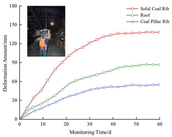 As can be seen from the figure, after implementing the on-site support scheme, the deformation of the roof, solid coal rib, and coal pillar rib all increased, but the total amount was small, with a slow increase basically occurring within 30 days, after which it entered a stable state without significant fluctuations. By position, the deformation of the solid coal rib > the deformation of the roof > the deformation of the coal pillar rib. The maximum deformation of the solid coal rib was 130 mm, the roof was 79 mm, and the coal pillar rib was 45 mm, all far less than the deformation data of the roadway surrounding rock measured at the early monitoring section on-site.