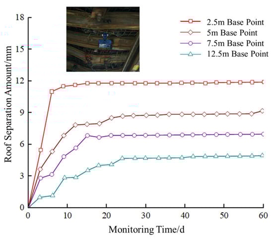 To monitor and statistically analyze the displacement of the roof strata in the test section after implementing the synergistic support–unloading control scheme, a multi-point extensometer was used for long-term monitoring in the monitoring section. The deep displacement changes are shown in Figure 27.