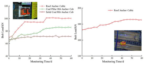 As can be seen from the figure, for the on-site monitored bolts, the designed initial pre-tightening force was 60~70 kN. The load of the roof bolts increased rapidly in the initial monitoring stage, slowed down after about 10 days, gradually stabilized, and had another significant increase at about 37 days, finally stabilizing at about 100 kN. The bolts on the coal pillar rib fluctuated and increased in the early stage, slowed down after about 30 days, and finally stabilized at about 82 kN. The bolts on the solid coal rib showed little overall change during the entire monitoring period and finally stabilized at about 69 kN. The final stable loads of the above three are all far less than the designed anchorage force of 190 kN for the bolts, indicating a high bearing reserve. For the on-site-monitored anchor cables, the initial designed pre-tightening value was 175 kN, which gradually increased slowly during the entire monitoring period and finally reached 185 kN. Relative to the designed anchorage force of 350 kN for the anchor cables, there is still considerable bearing reserve space; the remaining bearing reserve space is 47%.