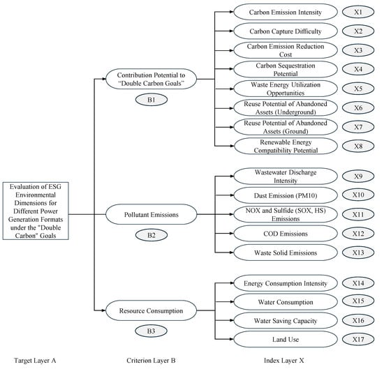 These evaluation systems maintain common attention to core issues, such as climate change, pollution emissions, and resource use, and reflect the differentiated characteristics that international institutions focus on regarding supply chain management; Chinese domestic systems emphasize policy compliance, reflecting the phased characteristics of ESG development in different market environments, which can be applied in different scenarios and purposes. However, overall, they are still the principles or indicators common to multiple industries, with insufficient pertinence, and the attention to the “Dual Carbon Goals” is not comprehensive or specific enough and cannot fully or accurately reflect the specific practice performance of the power generation format supporting the “Dual Carbon Goals”. Therefore, the environmental indicators are selected by emphasizing the impact evaluation of the power generation format on the environment under the “Dual Carbon Goals”, and the environmental index evaluation system of the power generation format is constructed under the “Double Carbon Goals”, as shown in Table 4.