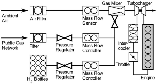Schematic drawing of the fuel supply system. The system includes separate mass flow controllers for NG and and a venturi gas mixer for air–fuel mixing.