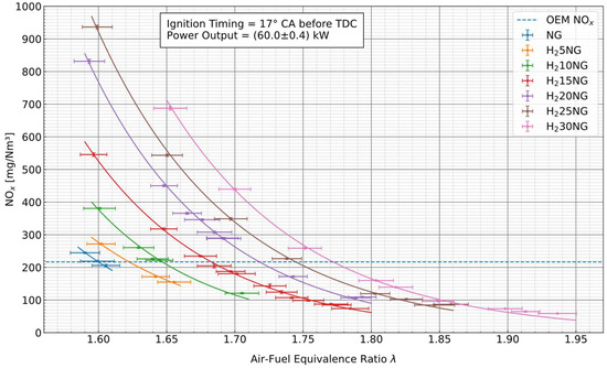 Nitrogen oxide emissions versus air–fuel equivalence ratio for hydrogen-enriched fuel mixtures. Hydrogen-rich fuels enable leaner combustion and broaden the applicable range, giving flexibility for optimized engine control. The dashed horizontal line represents the baseline nitrogen oxide emissions under NG operation at .