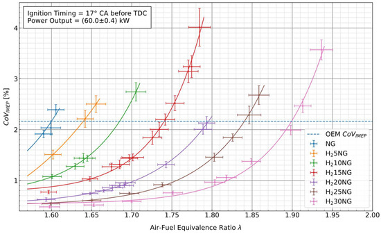 CoV of IMEP versus air–fuel equivalence ratio for various hydrogen/natural gas mixtures.
