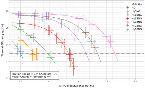 This empirical equation defines the minimum air–fuel equivalence ratio required to achieve emissions below the natural gas baseline for a given hydrogen concentration. It is essential for identifying operating points where all three performance indicators, , and thermal efficiency, can simultaneously outperform the conventional natural gas configuration. As such, it provides a necessary boundary condition for the multi-parameter optimization developed in Section 3.3.